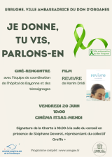 19h: Diffusion du documentaire « Revivre » de Karim Didri au cinéma Itsas Mendi. Puis un échange aura lieu avec la présence du Dr Julie Larrieu Nazabal, accompagnée de l’équipe de coordination don d’organes de l’hôpital de Bayonne et de Stéphane Devoret.